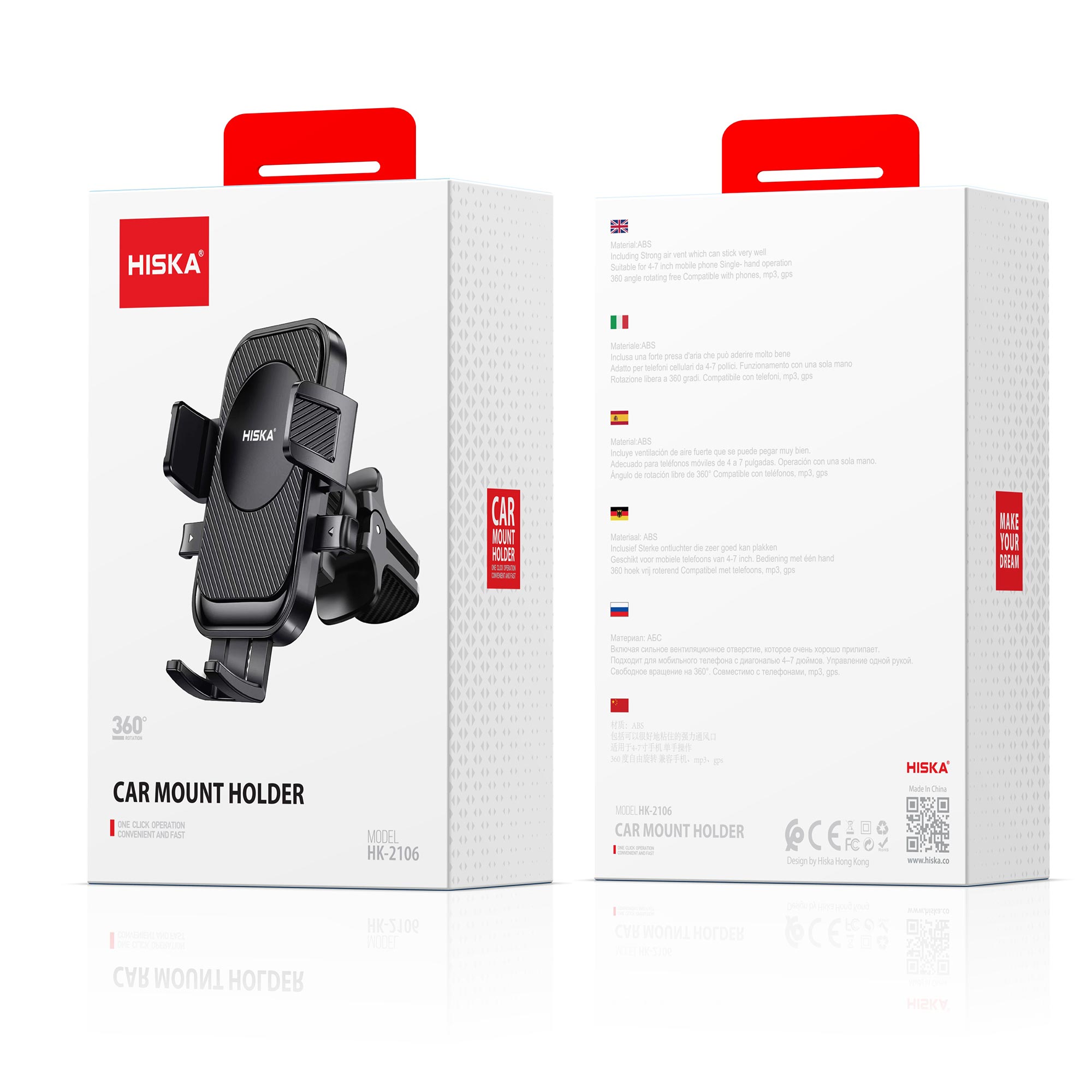 هیسکا HK-2106 برای دریچه کولر خودرو طراحی شده است. شما می‌توانید آن را بدون ابزار خاص نصب کنید و گوشی را جلوی دید خود قرار دهید. این طراحی از داغ شدن دستگاه جلوگیری می‌کند و مانع تابش مستقیم نور خورشید روی گوشی می‌شود.