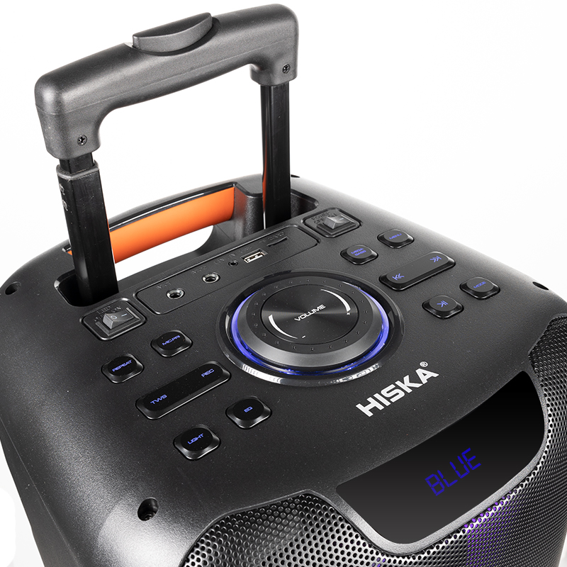 اسپیکر چمدانی هیسکا مدل 1009 با طراحی چمدانی، کاملاً قابل حمل است و برای جابجایی راحت به چرخ‌های مخصوص مجهز شده است.