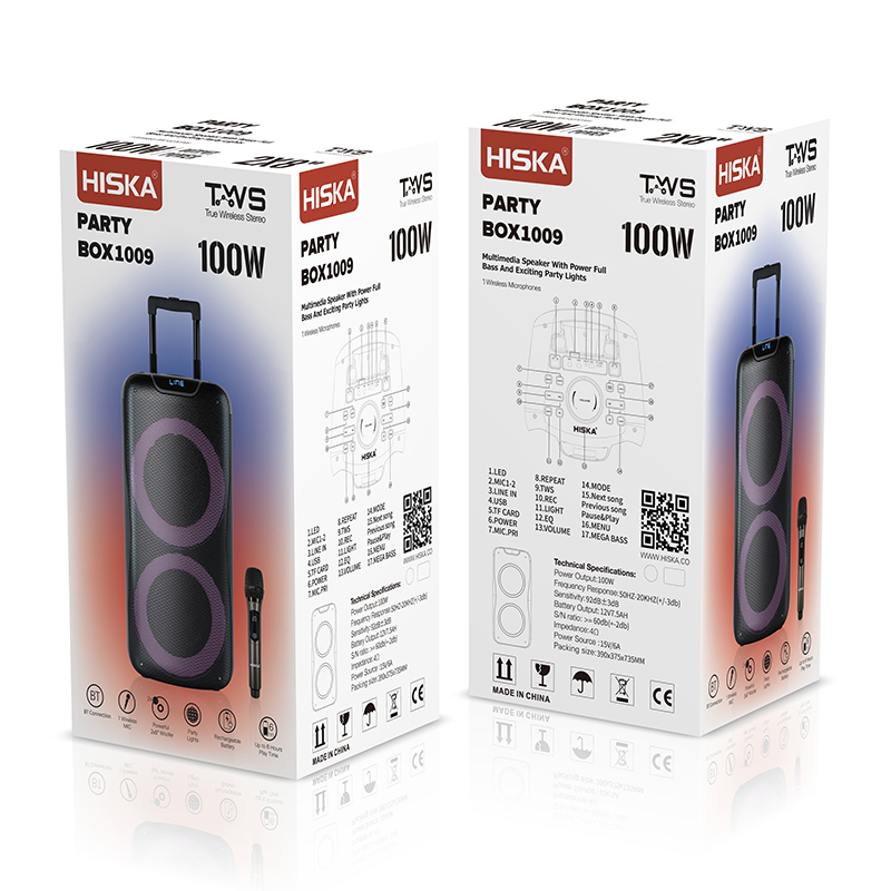 اسپیکر چمدانی هیسکا 1009 با توان خروجی 100 وات و دو اسپیکر 8 اینچی، صدای قدرتمند و فراگیر 360 درجه ارائه می‌دهد که برای مهمانی‌ها و فضاهای باز بسیار مناسب است. طراحی چمدانی با چرخ و دسته حمل، جابجایی آن را آسان کرده و باتری 7500 میلی‌آمپرساعتی، تا 6 ساعت پخش مداوم را تضمین می‌کند.